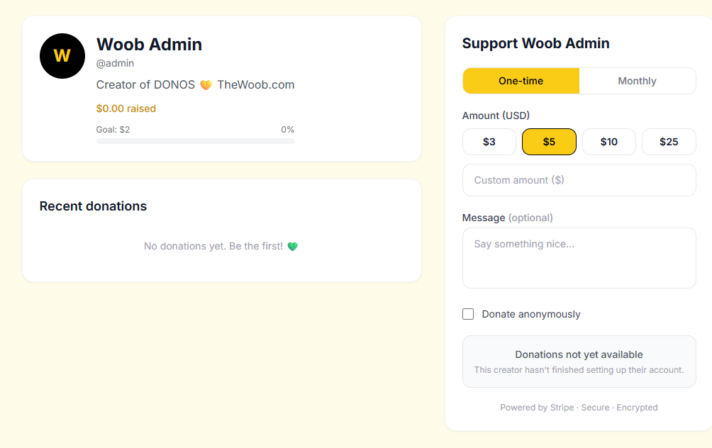 donos.thewoob.com/donate/username - →Donors choose a preset or custom amount, toggle one-time vs. monthly, add an optional message, and donate anonymously if they want